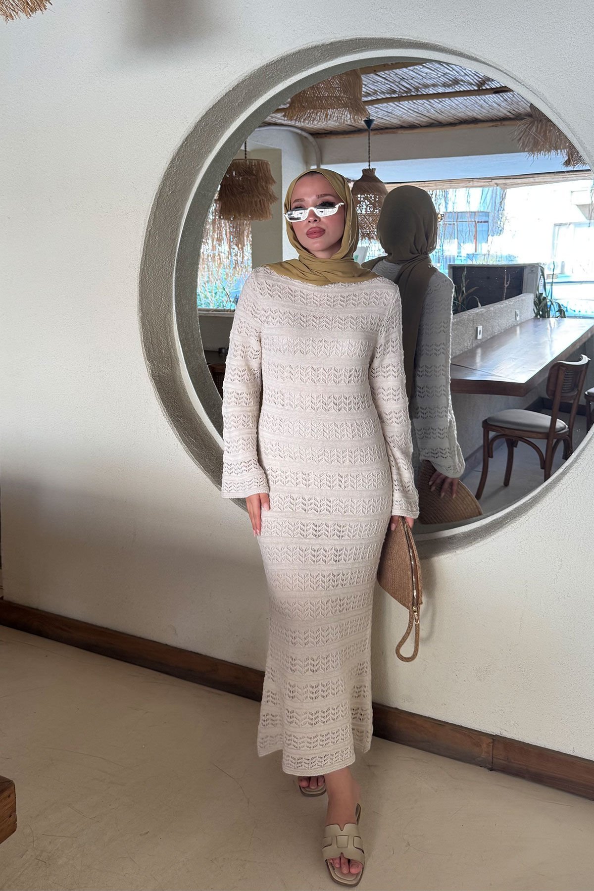 ASTARLI DESENLİ TRIKO ELBİSE 67-2225 - BEJ