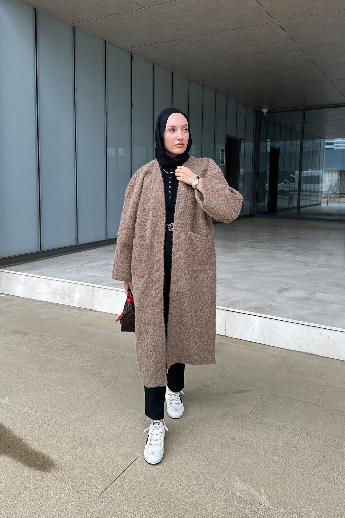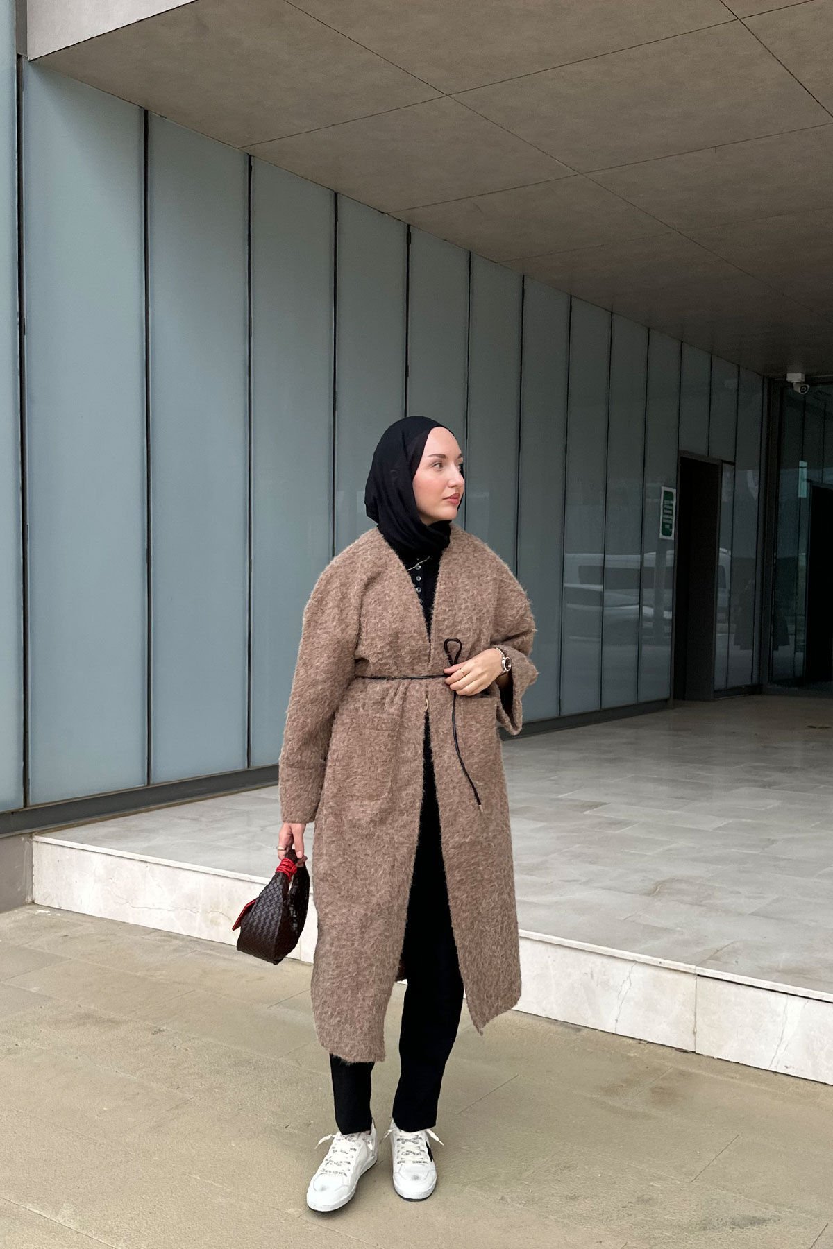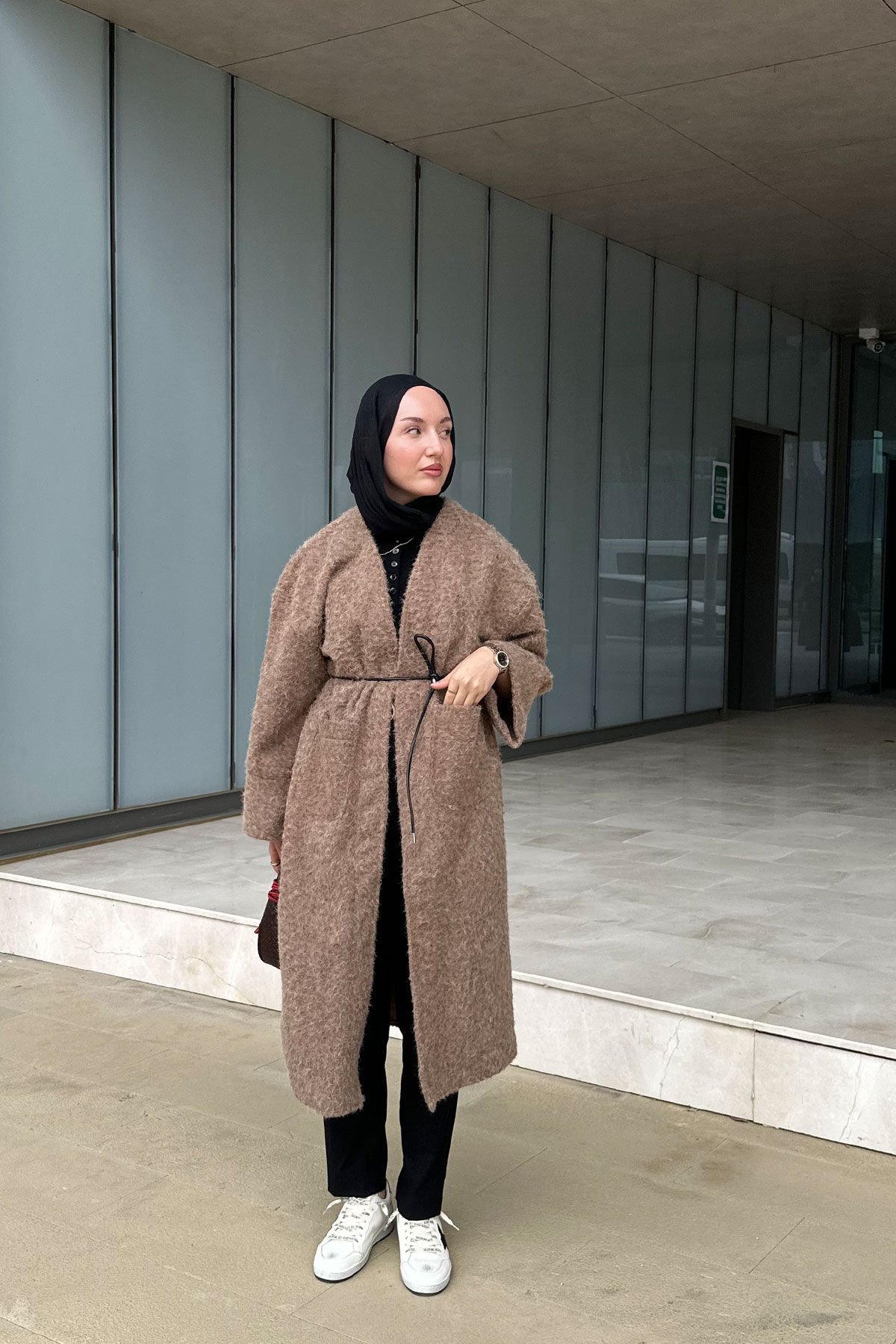 - Oversize kesim,Astarsız, kemerli kaşe kaban.