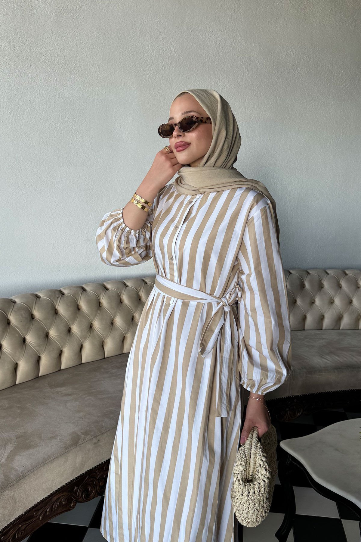 KEMERLİ UZUN ELBİSE 9-51524 - VİZON