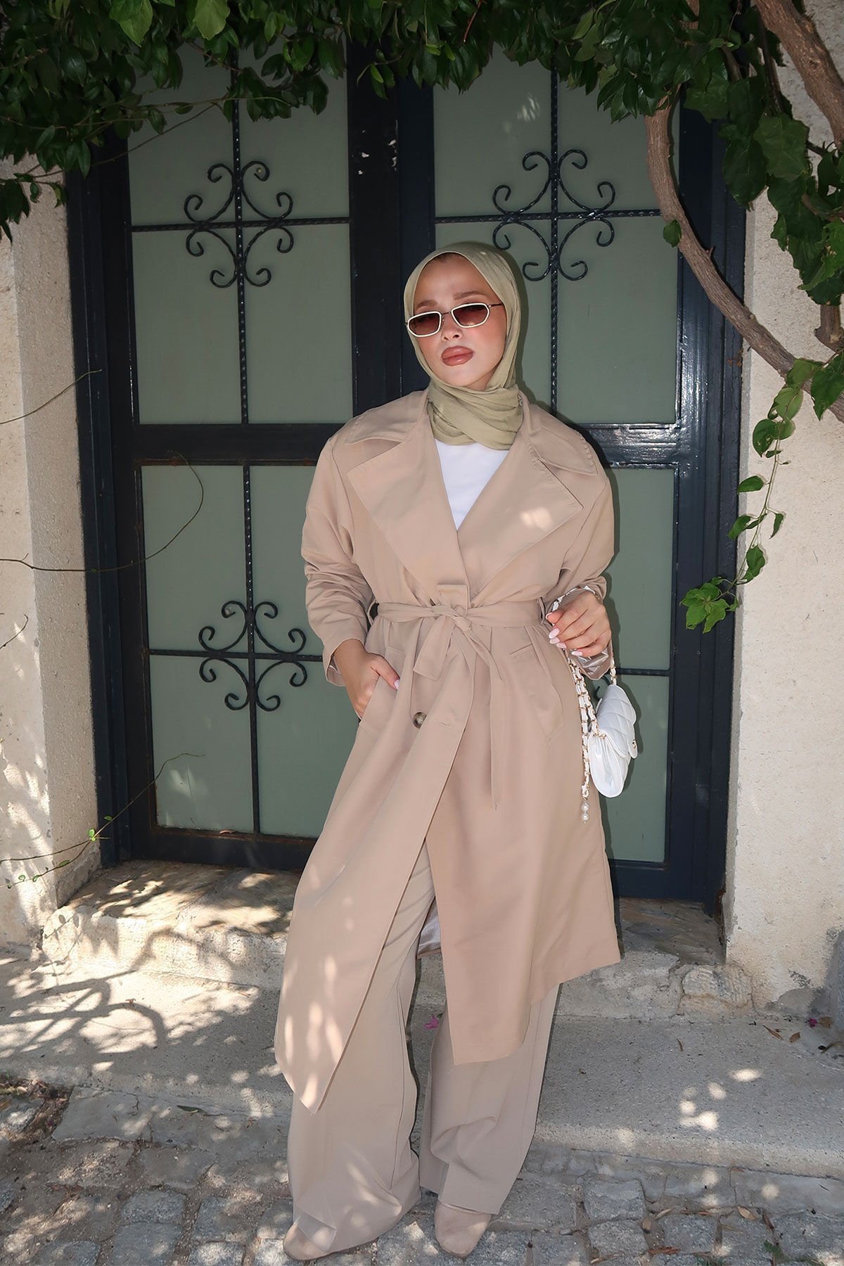 - Oversize kesim,Astarlı, kruvaze yaka, kemerli trençkot.