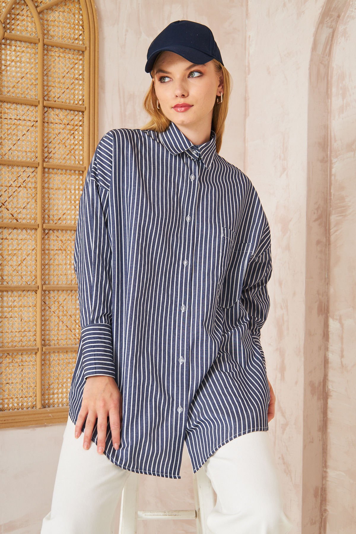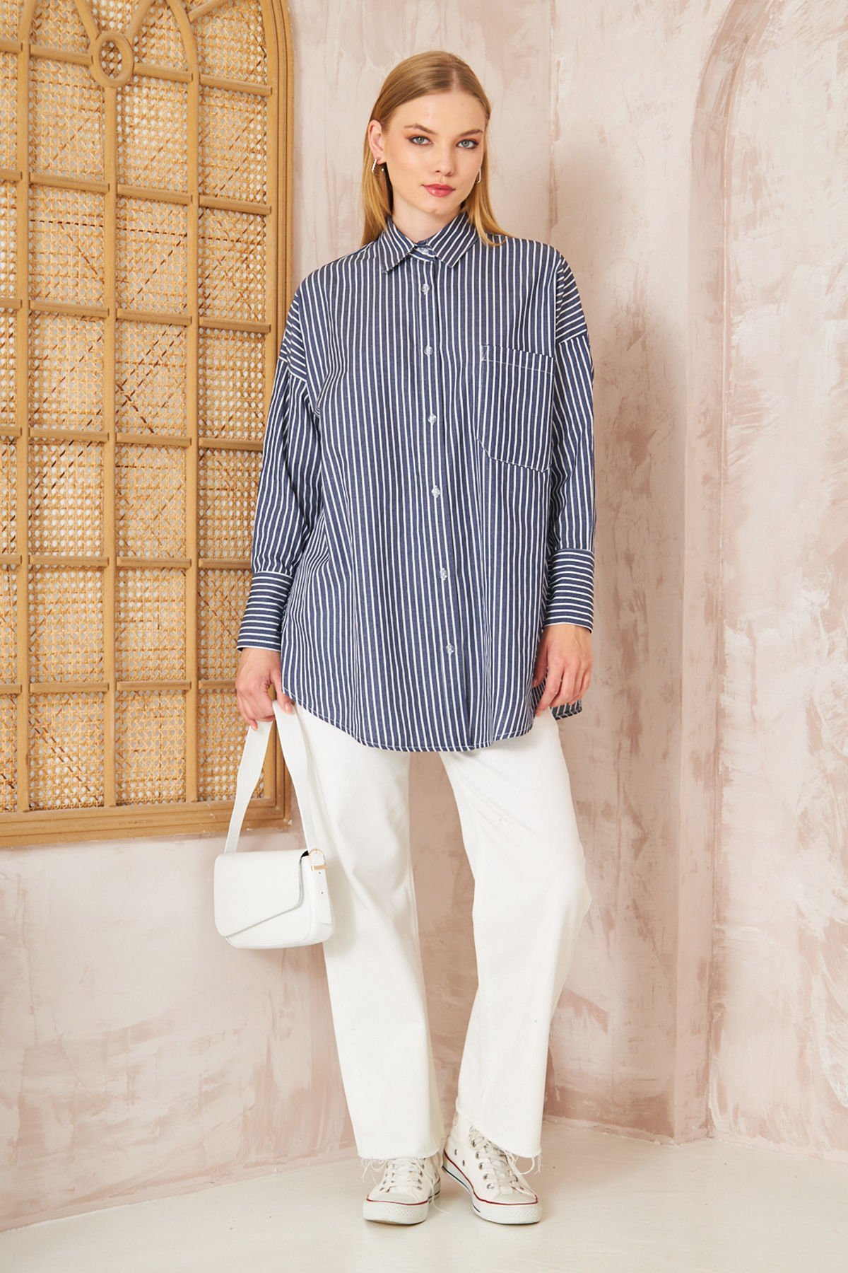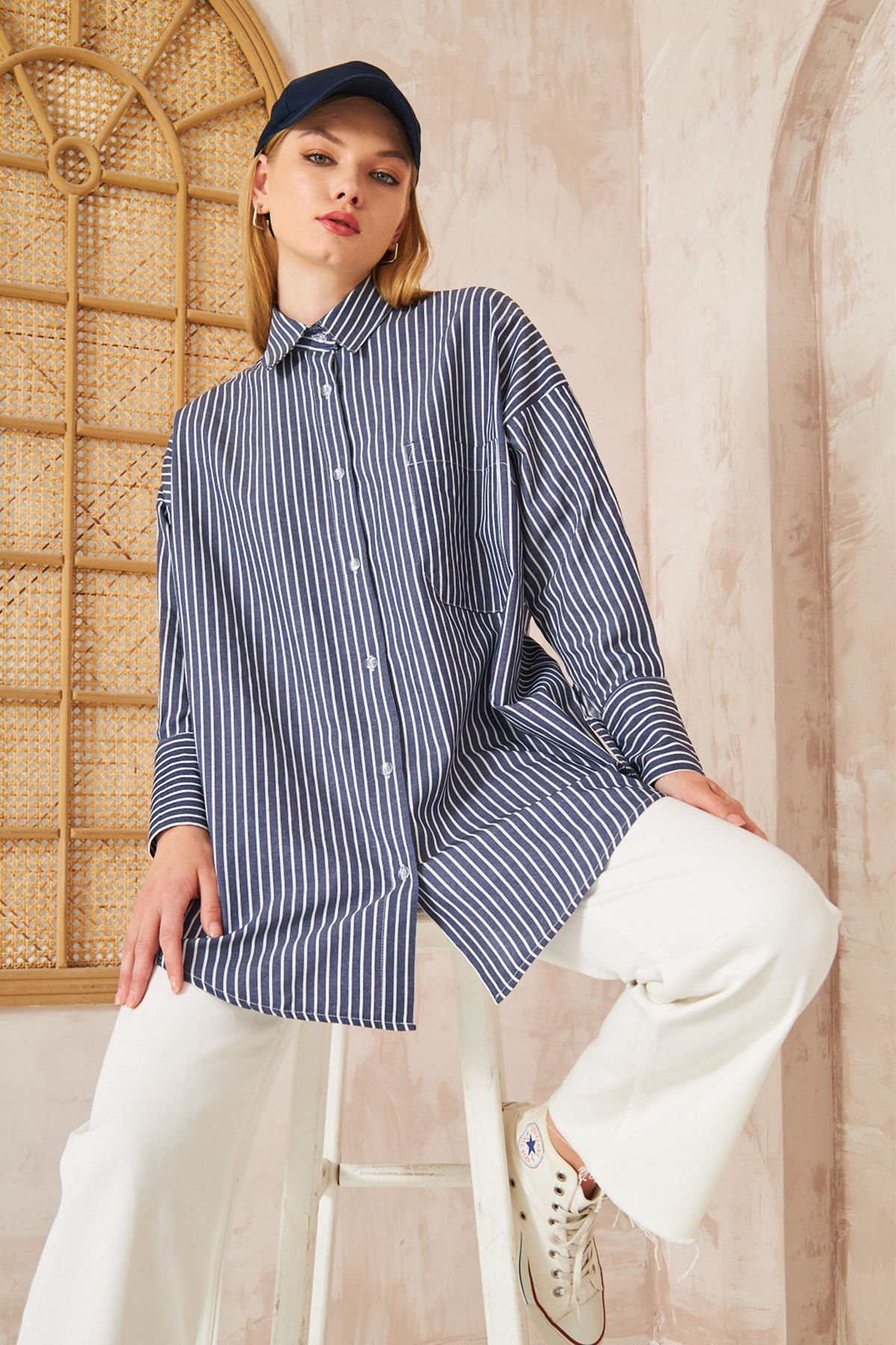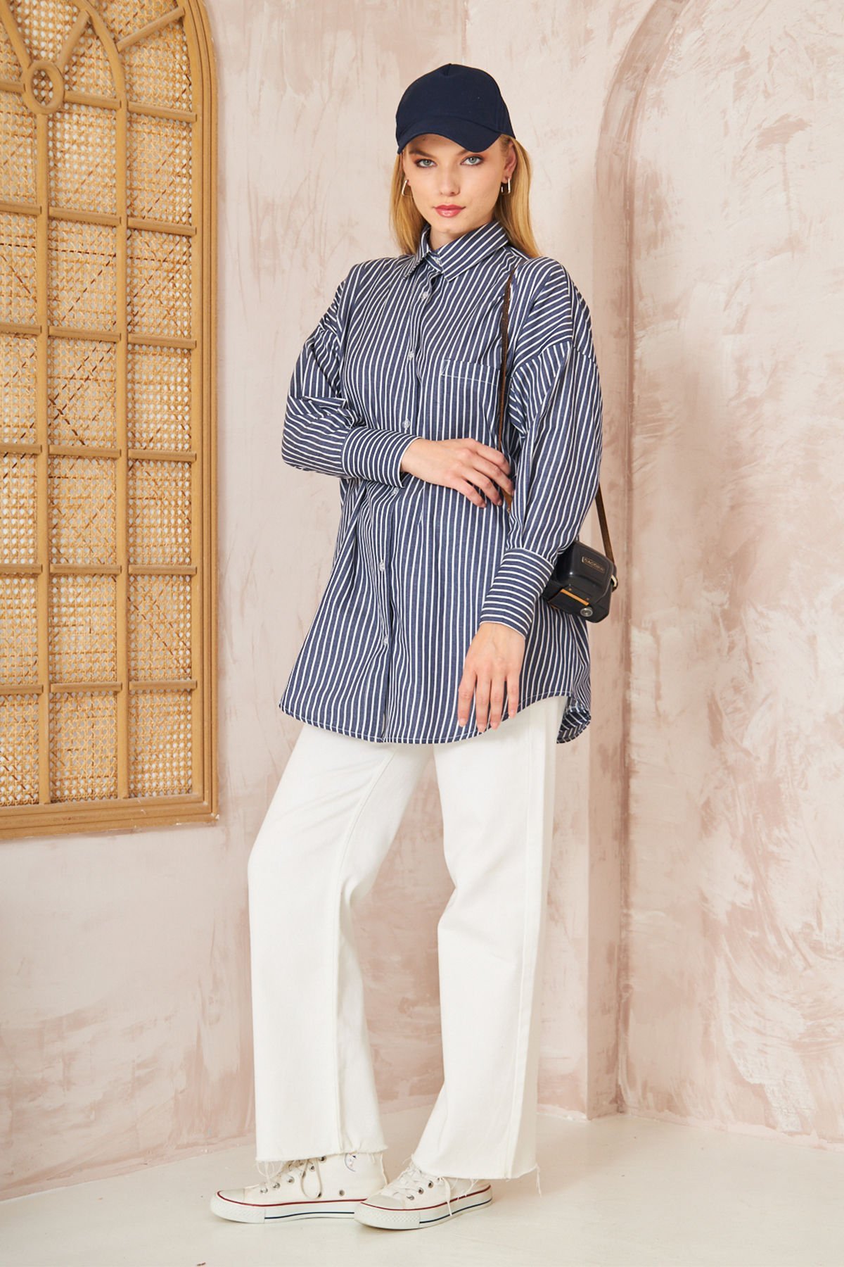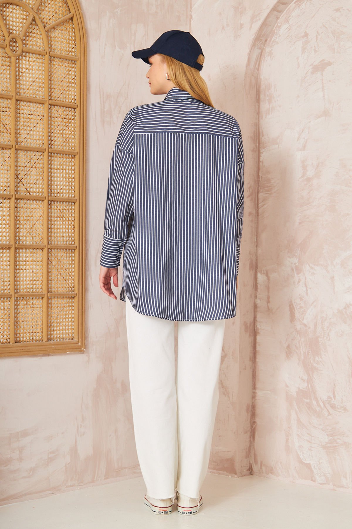 Oversıze Çizgili Gömlek 4-6676 - LACİVERT