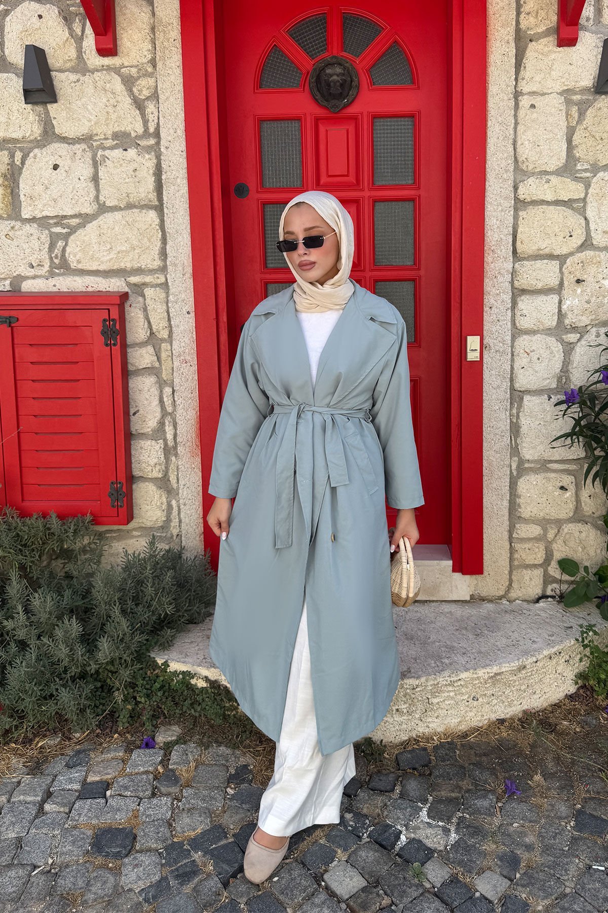 - Oversize kesim,Astarlı, kruvaze yaka, Arka Pelerinli, kemerli trençkot.