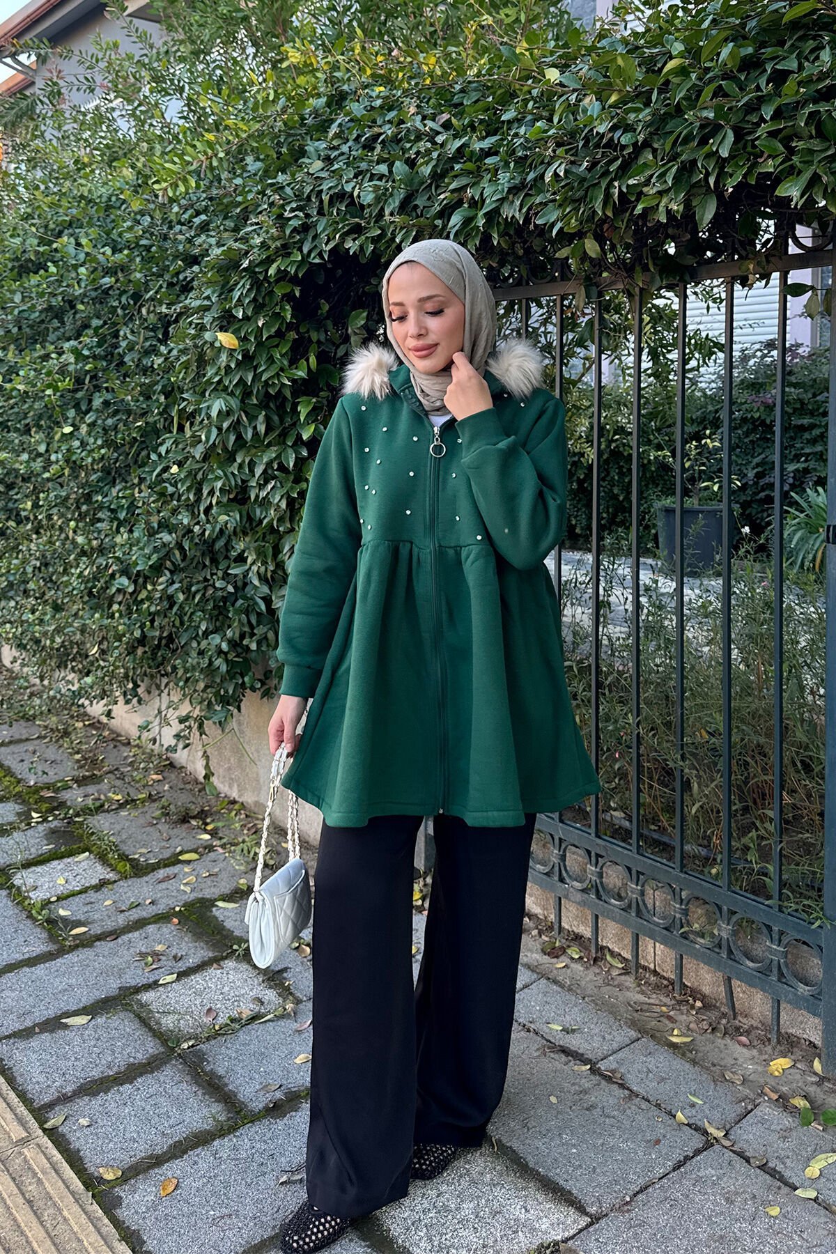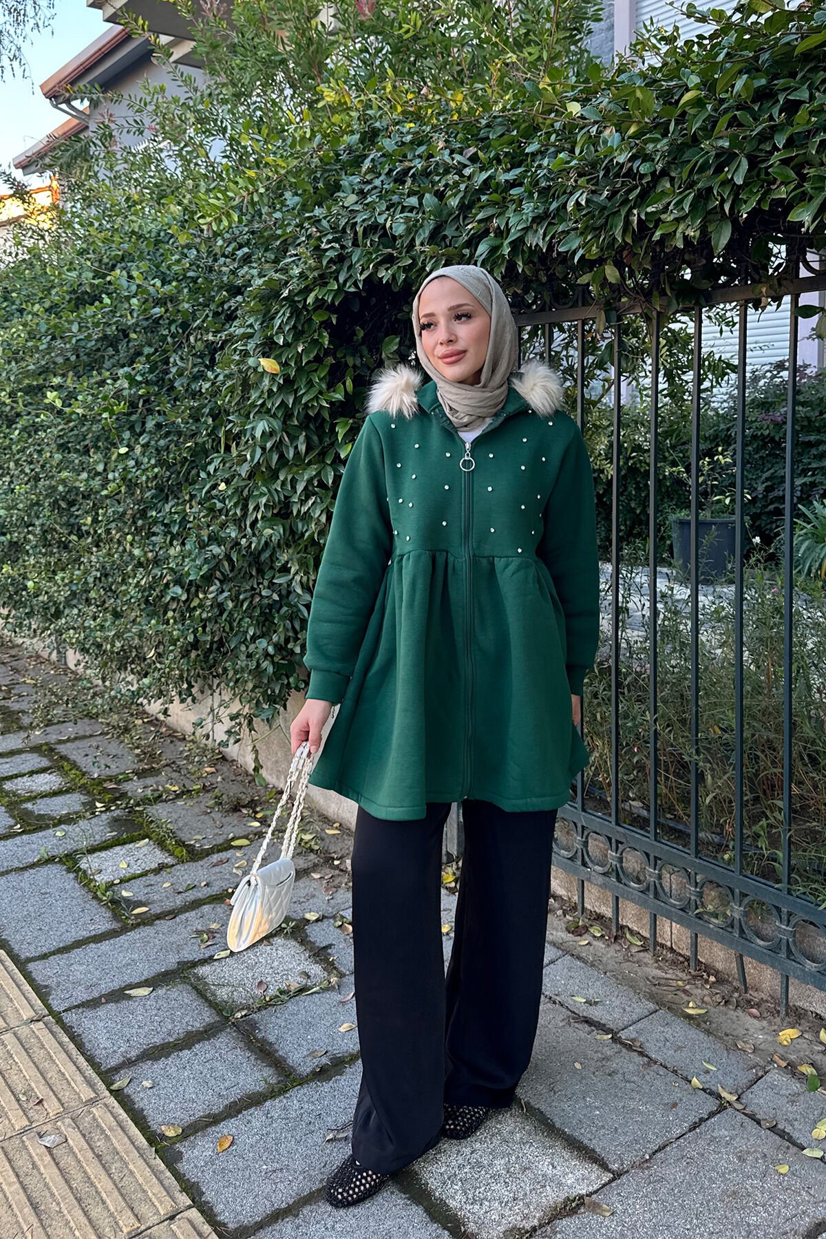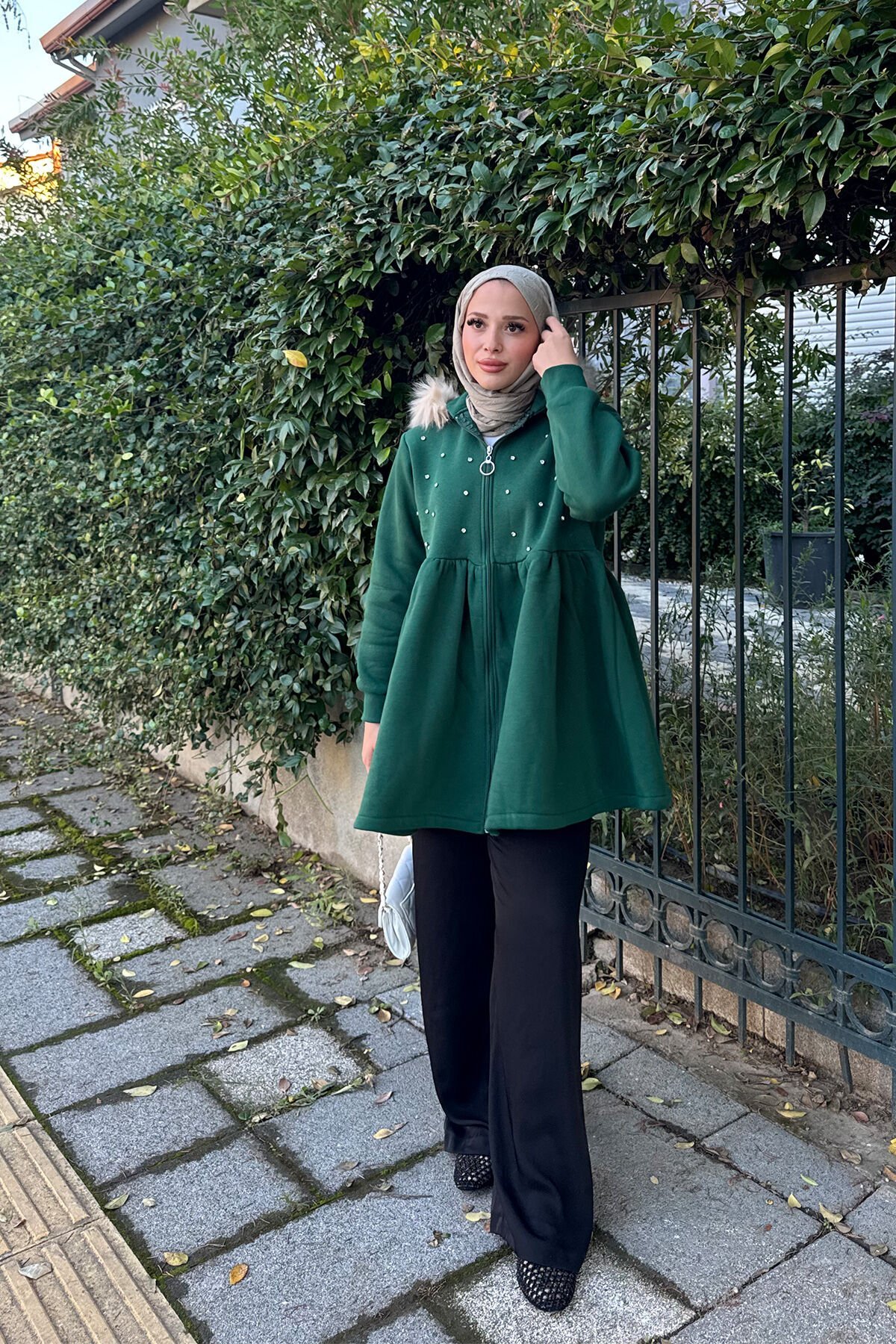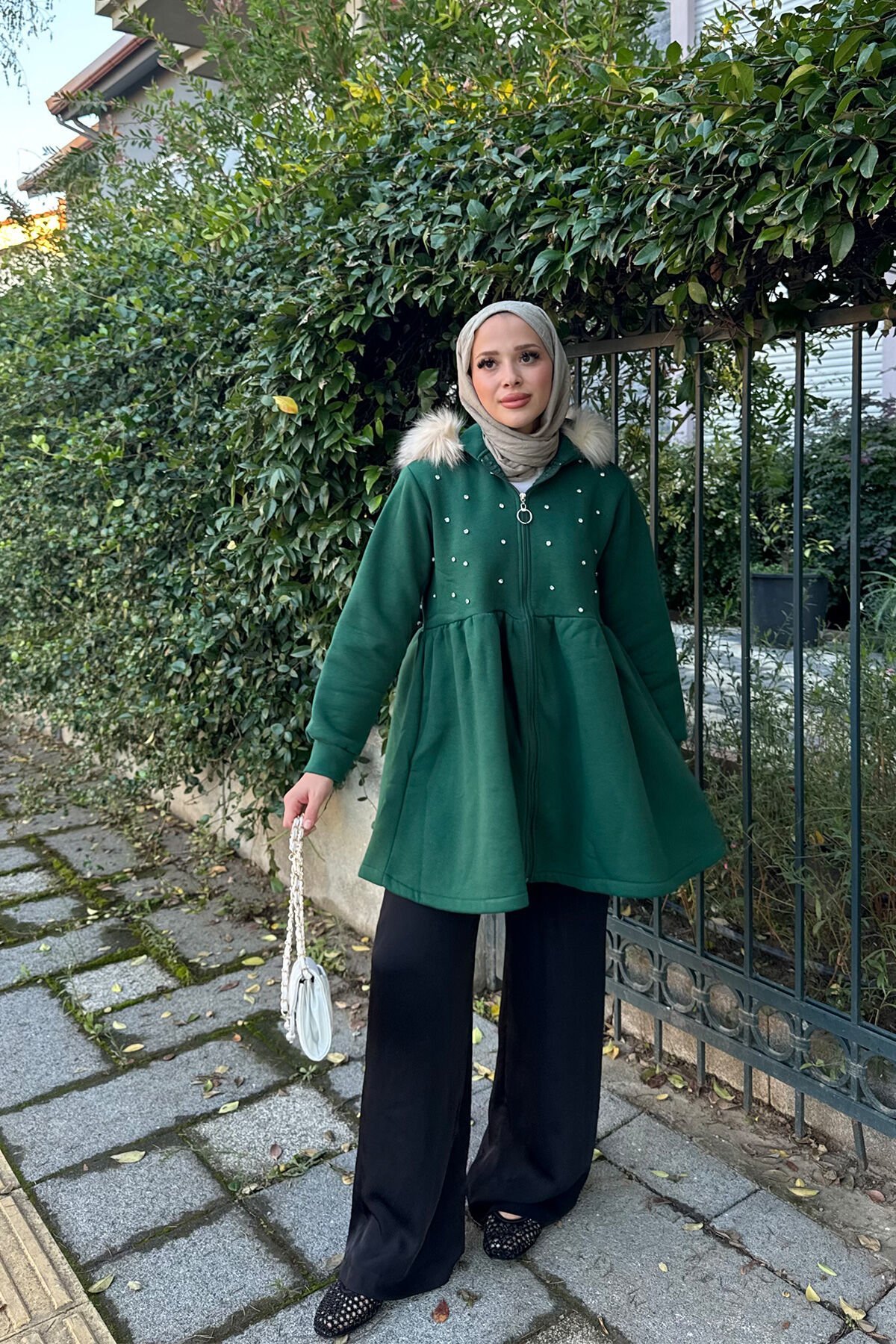 Taşlı Kürklü Ceket 4-6420- YEŞİL