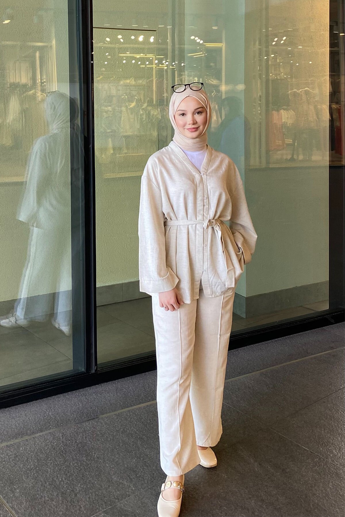 V YAKA DÜGMELİ TAKIM 9-51872 - EKRU